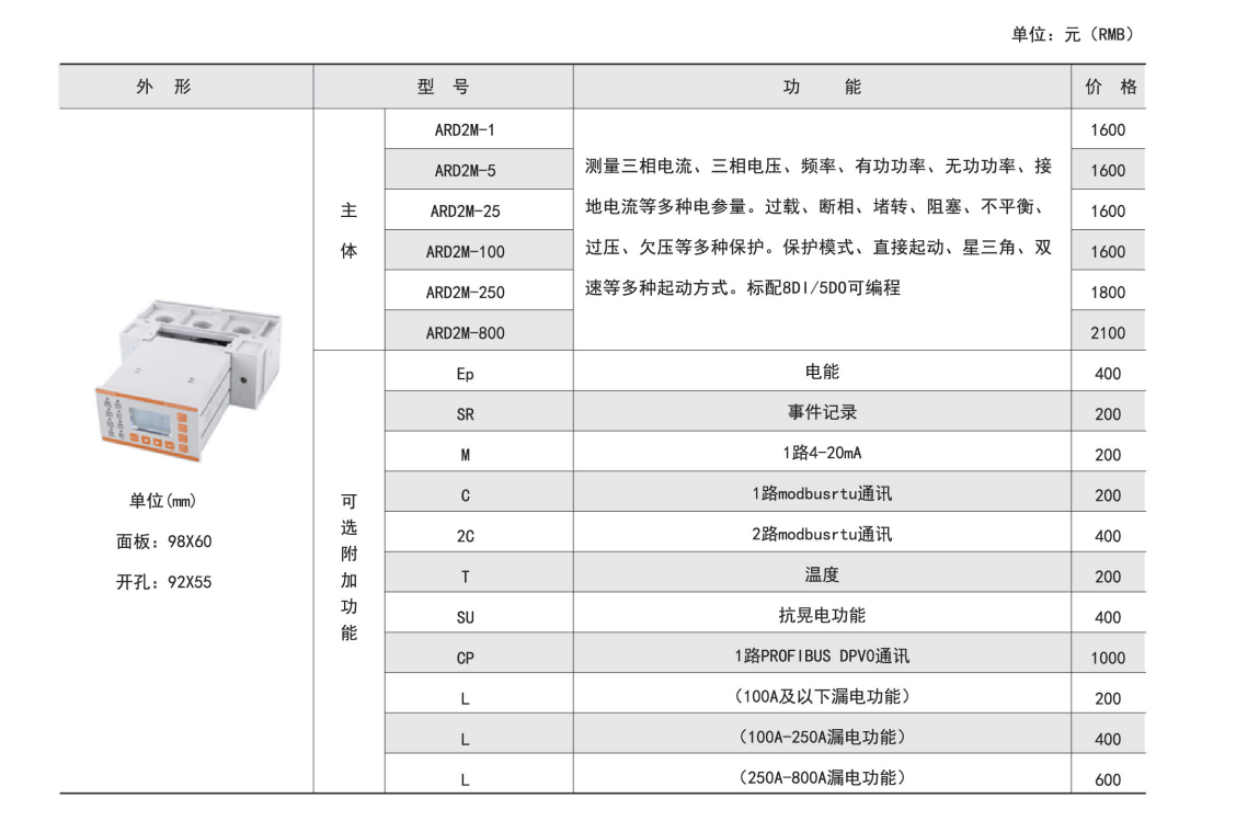 ARD2M 智能電動機保護器(以下簡稱保護器)適用于額定電壓至 660V 的低壓電動機回路,集保護、測量、控制、通訊、運維于一體。其完善的保護功能確保電動機安全運行,帶有邏輯可編程功能,可以滿足多種控制方式。可選配不同通訊模塊適應(yīng)現(xiàn)場通訊需求。