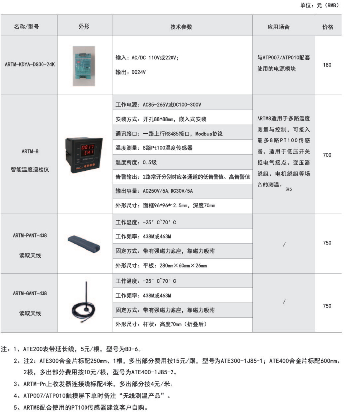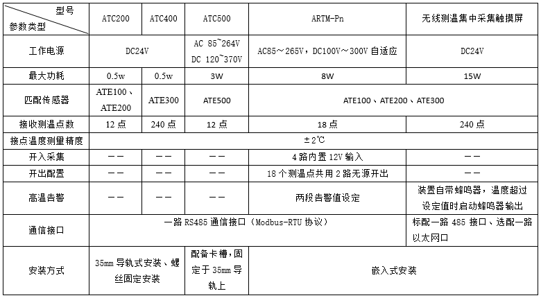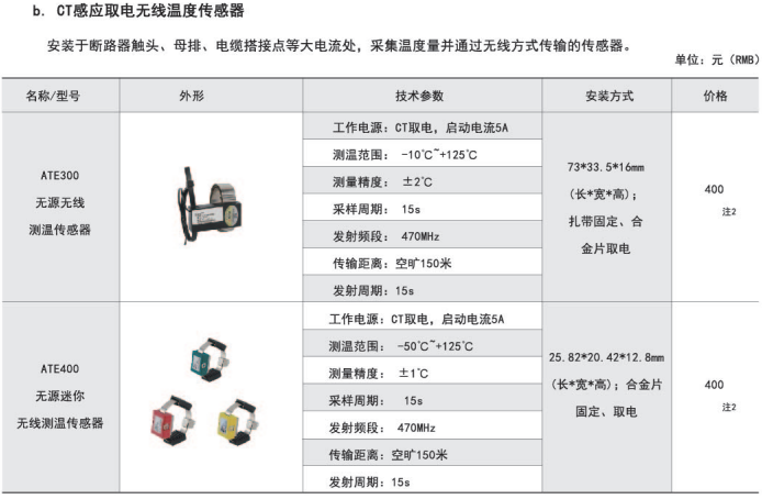 ARTM-Pn無線測溫裝置:ARTM-Pn無線測溫裝置可以單獨安裝在高壓柜、低壓抽屜柜內,每臺裝置可以接收18個傳感器的數據,傳感器型號可選配ATE100、ATE200、ATE300。裝置帶有一路485接口,可將采集到的溫度數據上傳到監控中心。