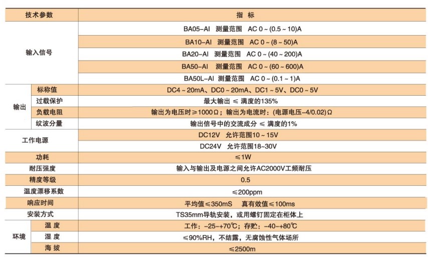 BA系列產品應用電磁感應原理,對電網中的交流電流進行實時測量,將其隔離變換為標準的直流信號輸出。