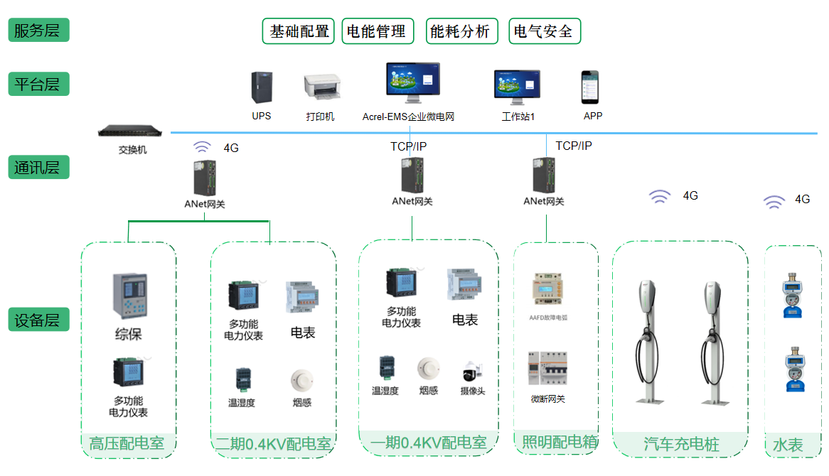 現場安裝的各類儀表、設備均接入ANet智能網關,由網關完成協議解析、報警生成、邏輯控制、本地存儲等邊緣計算任務,數據經光纖網絡上傳至EMS智慧能源平臺。