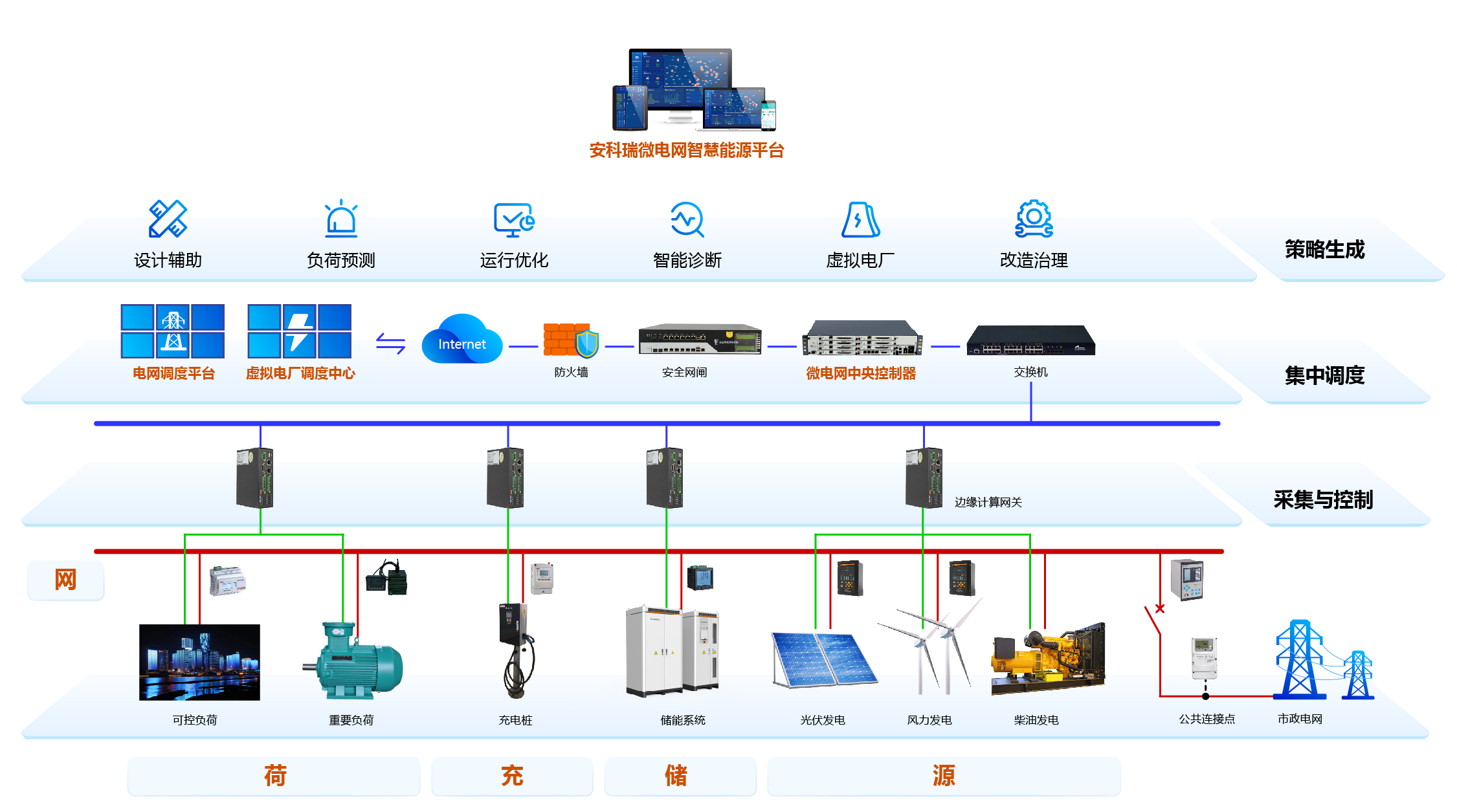 EMS智慧能源平臺通過在源、網、荷、儲、充的各個關鍵節點安裝監測、分析、保護、治理裝置,通過邊緣計算網關采集有關運行數據,深入統計分析能源消耗,為用戶能源使用規劃、降低能源成本,降低能源消耗總量和強度,降低碳排放總量和強度提供決策支撐。