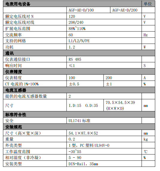 UL認證應用于分布式電源的逆變器、變流器、控制器標準;光伏儲能單相防逆流電表,AGF-AE-D/200單相三線制,應用于澳洲、歐洲、北美等海外地區(qū);電流規(guī)格200A,配套開口式互感器,安裝方便;通訊通訊采用RJ45的物理接口