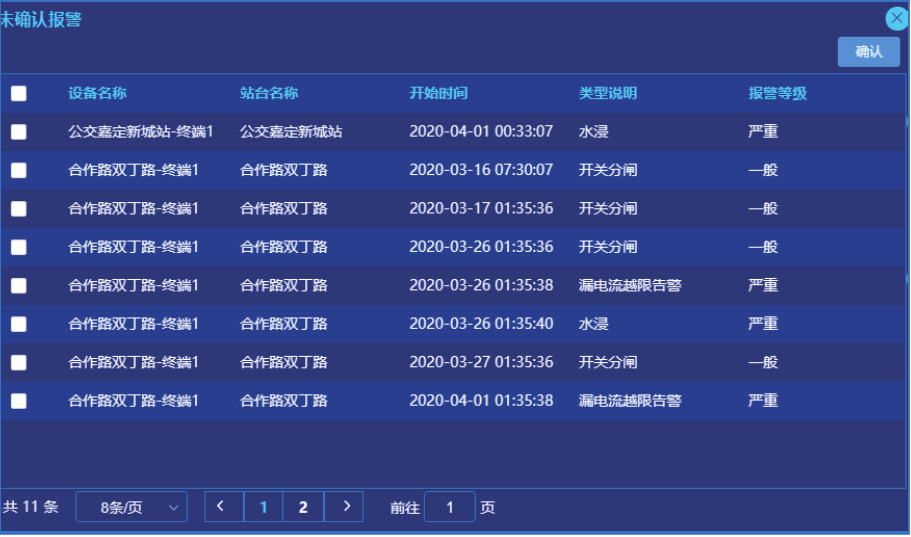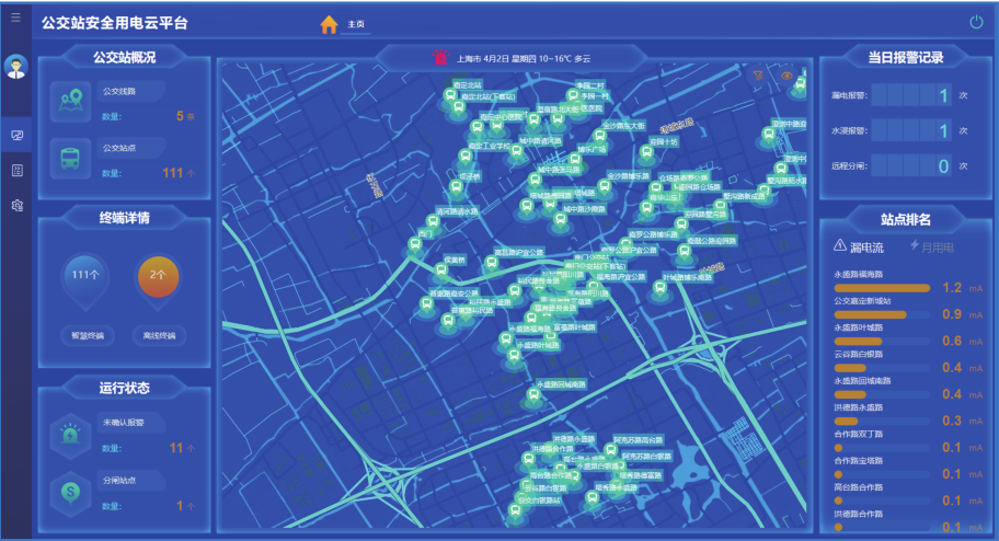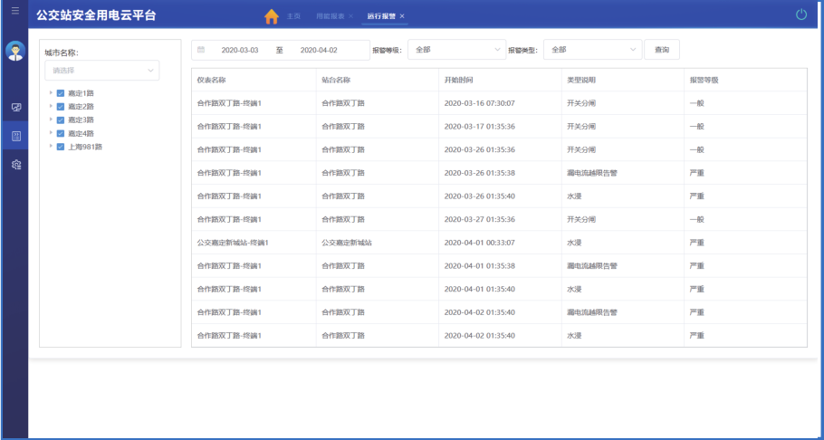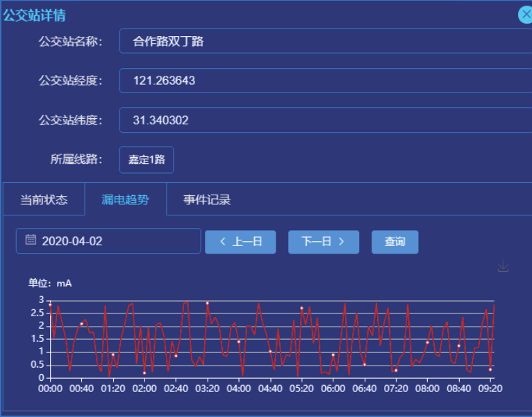用戶可查詢公交站臺的歷史漏電流數(shù)據(jù)、報警數(shù)據(jù)、用電數(shù)據(jù);