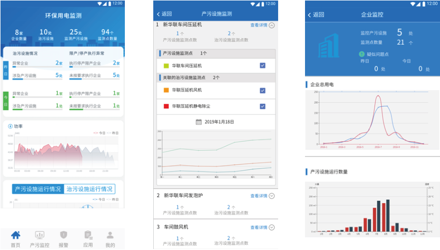平臺首頁顯示企業(yè)概況,用電統(tǒng)計,產(chǎn)污設(shè)施運行柱狀圖,治污設(shè)施運行柱狀圖,如圖所示: