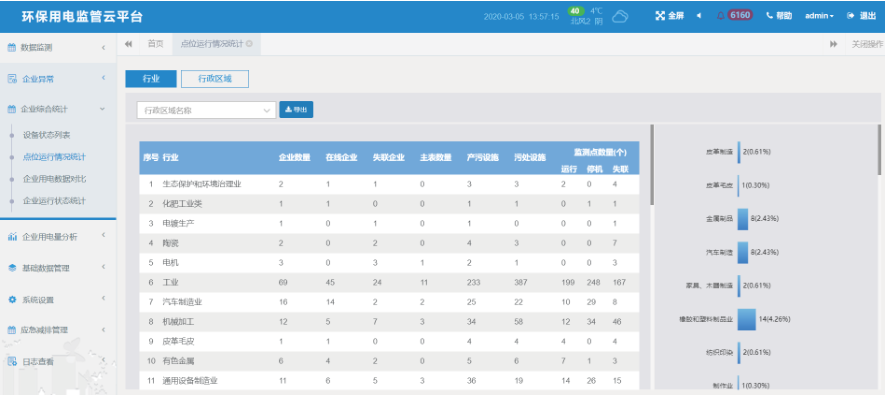 2.4.2點位運行情況分析:按行業(yè)或區(qū)域統(tǒng)計分析企業(yè)、監(jiān)測點、產(chǎn)污設(shè)施、治污設(shè)施等數(shù)量及運行狀態(tài)。
