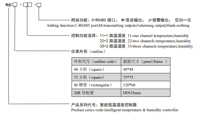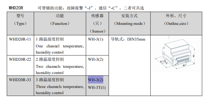1.WHD48,WHD72、WHD2OR,WHD46 分別多可接 1,2,3 路溫濕度傳感器;