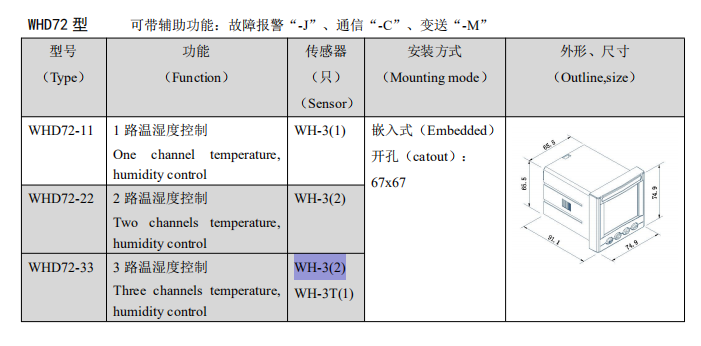 1.WHD48,WHD72、WHD2OR,WHD46 分別多可接 1,2,3 路溫濕度傳感器;