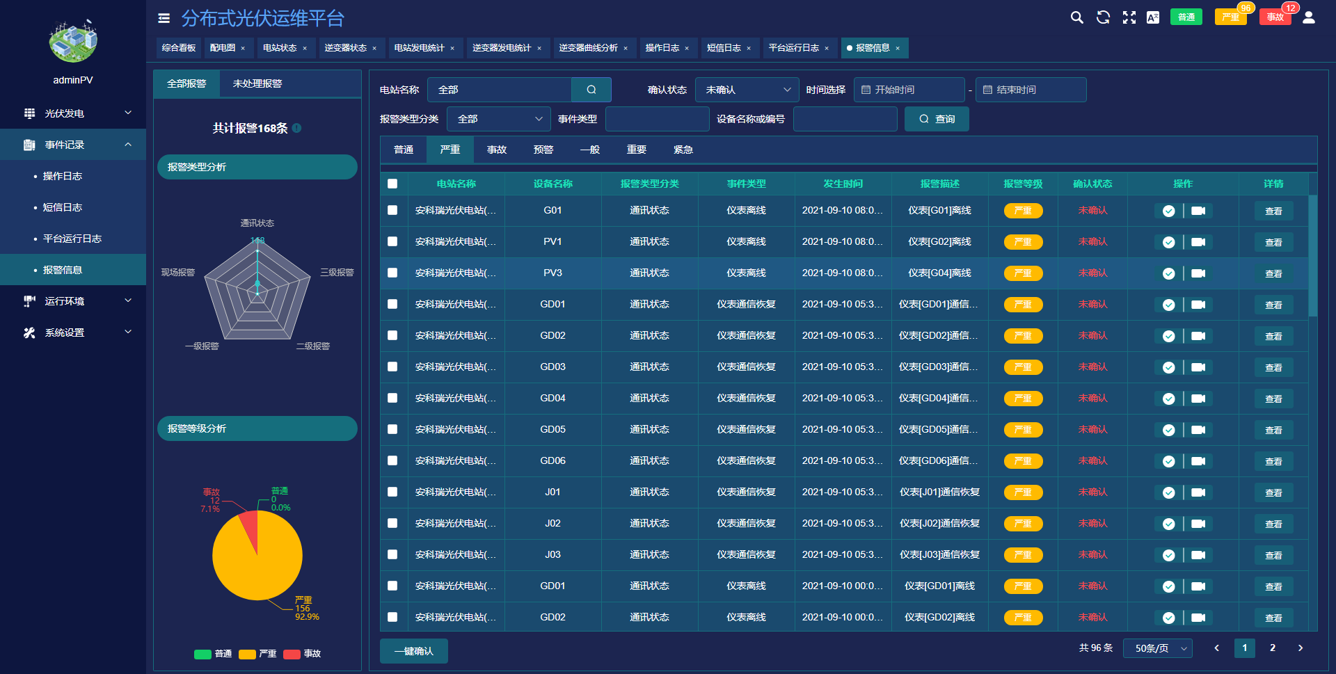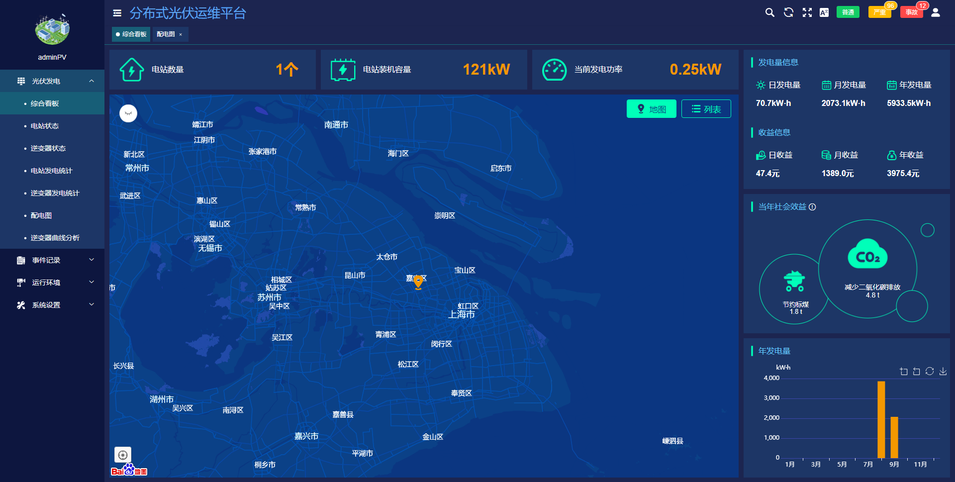 顯示所有光伏電站的數量,裝機容量,實時發電功率。