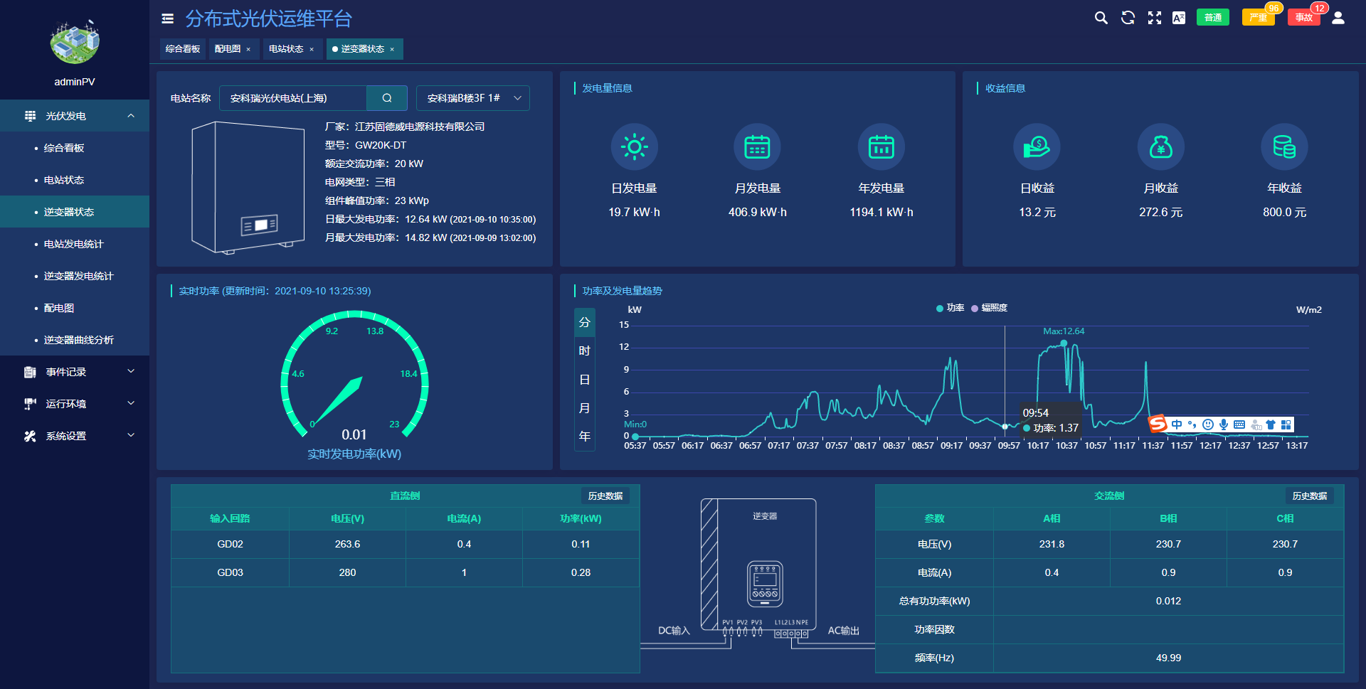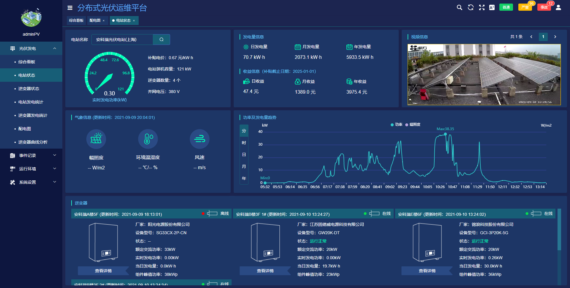 電站狀態展示當前光伏電站發電功率,補貼電價,峰值功率等基本參數。