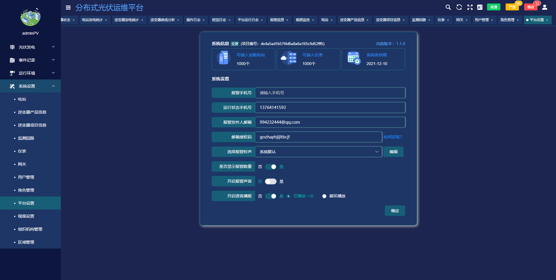 顯示當前平臺可接入最大儀表數量、系統有效期。可填寫報警管理人郵箱、手機、報警鈴聲、報警參數等基本信息。如圖所示